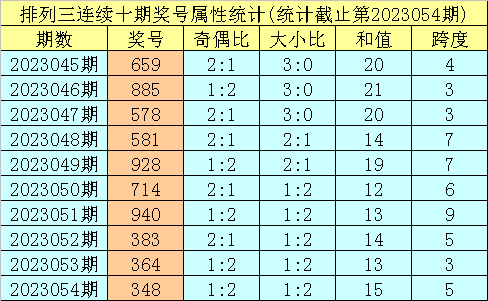 上期转头:胪列三第2023054期奖号:348。类型:组六,奇偶样式:奇偶偶,大小样式:小小大,和值:15,跨度:5。