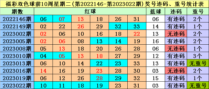 福彩双色球上周星期二(第2023022期)开出奖号:10 11 18 19 23 31 + 03,其中红球大小比为4:2,奇偶比为4:2,012路比为1:3:2,有连码,莫得开出重叠号码。